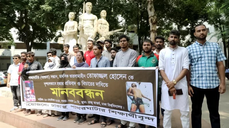 ঢাবির হলে চোর সন্দেহে যুবককে পিটিয়ে হত্যার বিচার দাবিতে মানববন্ধন